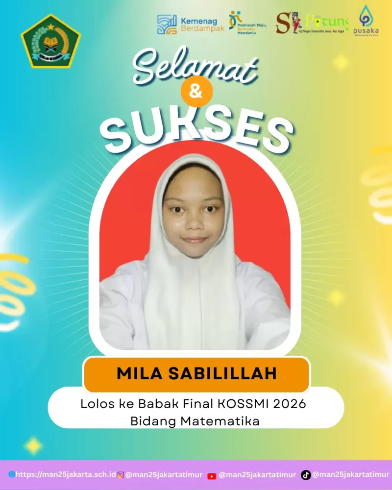 Segenap keluarga besar MAN 25 Jakarta Timur mendoakan dan mendukung Mila untuk meraih hasil yang terbaik pada final KOSSMI 2026 bidang Matematika.